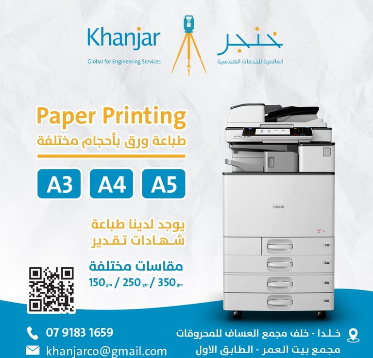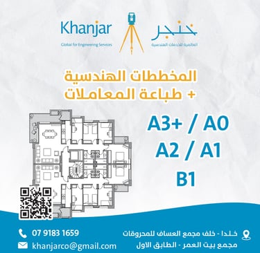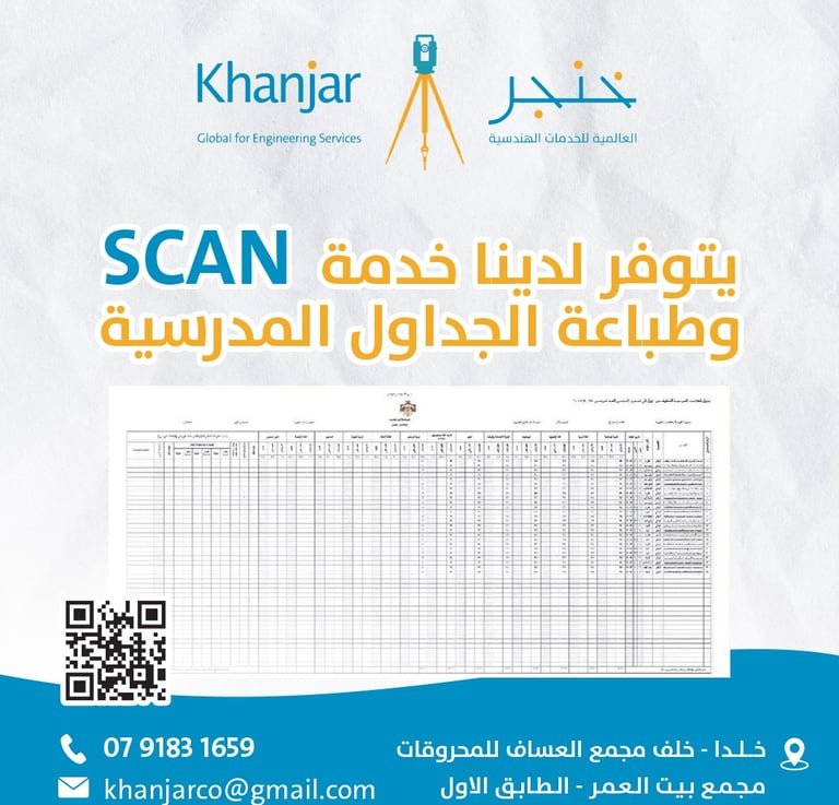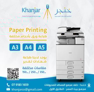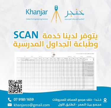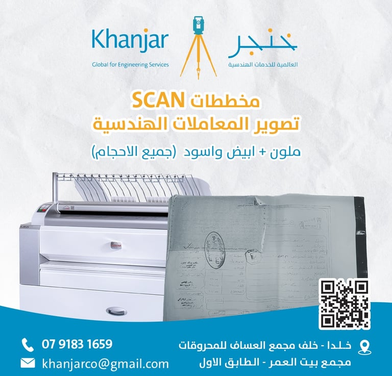 نقدّم خدمات سكانر ومسح ضوئي بجميع المقاسات وبأفضل الأسعار وبجودة عالية، لتلبية كل احتياجات مكتبكم والمشاريع الهندسية والمكتبية، مع توفير الوقت والجهد وضمان سرعة وكفاءة في إنجاز أعمالكم.